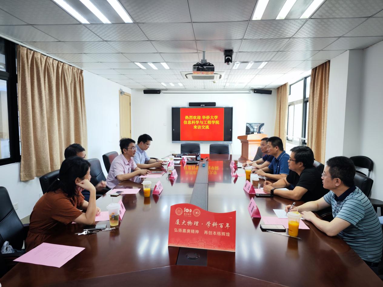 2023年7月5日,华侨大学信息科学与工程学院来访我院,进行中国大学生物理学术竞赛(CUPT)、全国大学生物理实验竞赛(CUPEC)和大学物理实验研究--教学等相关工作交流,参与人员包括厦门大学物理科学与技术学院陈理想副院长、吴顺情副院长、物理学系吴志明副主任、陈婷老师和刘雅文老师;华侨大学信息科学与工程学院欧聪杰副院长、大学物理实验中心陈宏斌主任、物理系翟云副主任和大学物理实验中心吕蓬副主任。